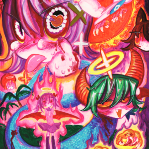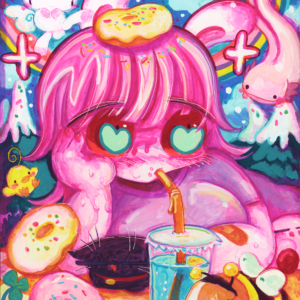 ピンクや蛍光色で彩られたキュートな世界が、血や事故、不安の影と絡み合う、