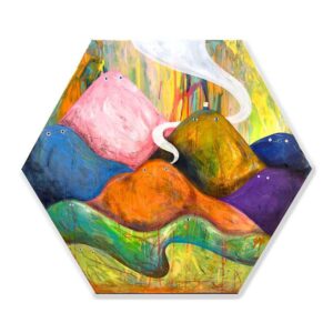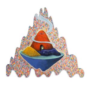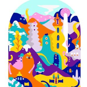 Most of the artworks by Zoie Lam appear as a dense and intricate tapestry of patterns juxtaposed with vivid colours — a remarkable visual contrast for a signature style that sets Lam apart from the rest. Choosing acrylic paint and wool yarn, and occasionally oil-base marker and technical drawing pen for black-and-white effect, Lam always fills her stylistic paintings in brilliant hues and especially with florescent colours. All details are completed with refined brushstrokes and delicate lines under the fine pen tip. The canvas is then topped with hand-knitted finishing touches. Her another favorite medium is wall painting, which includes walls of shops and impromptu painting alongside real-time animation and performance. Topping it all off, she has been invited to paint on Converse sneakers and design the fridge surface for N*ICE POPS. She believes that whether collaborating with different brands, or drawing on unique objects and materials for all sorts of occasions, these are challenges which she enjoys experimenting to break new boundaries. There are imaginary creatures modelled on peanut and other food, as well as those from the Food Planet, who all share the limelight all through her paintings. Lam, for example, likes to present the inner thoughts of one of the central characters — the flat-headed, plump eggplant. By incorporating positive messages and vibrant colours into her artworks, she hopes to bring smiles and encourage positive thoughts for everyone to continue fighting for their dreams.