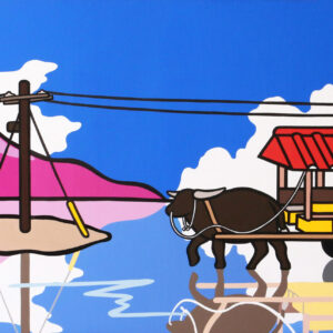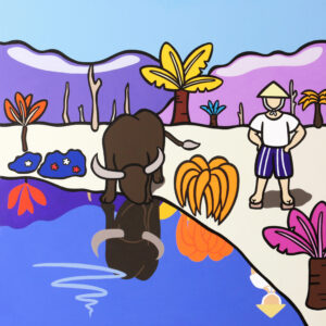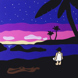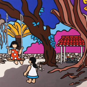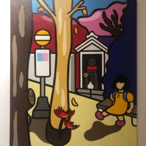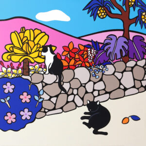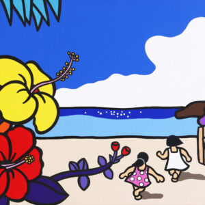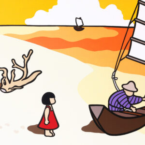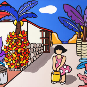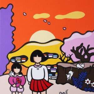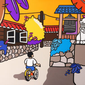 Today, the number of good-old Japanese rural landscapes as well as children playing there is rapidly decreasing. Her desire to preserve such beautiful sceneries prompts her to continue to paint them powerfully. Her work fuses tradition and freshness, forming a pop world that is uniquely nostalgic.