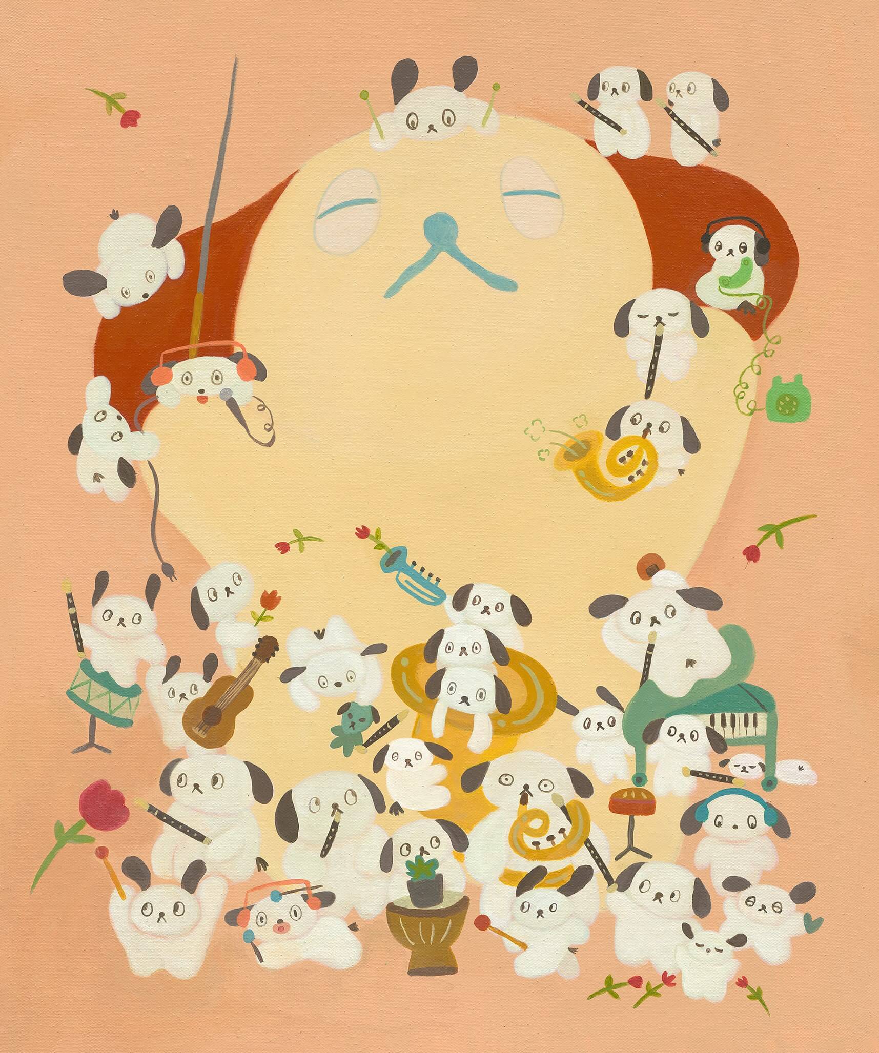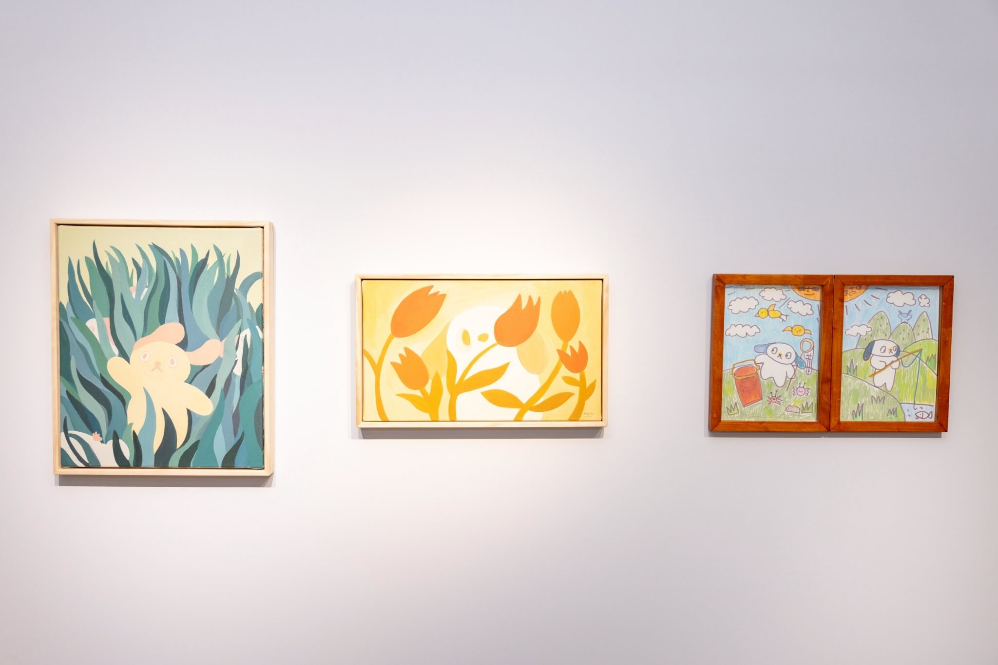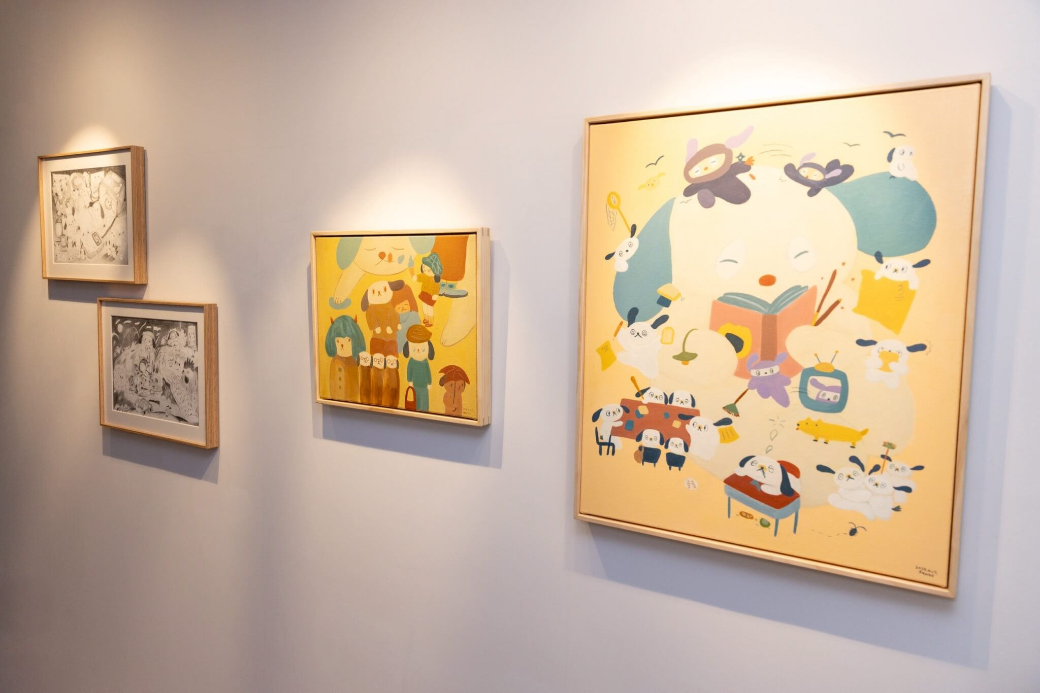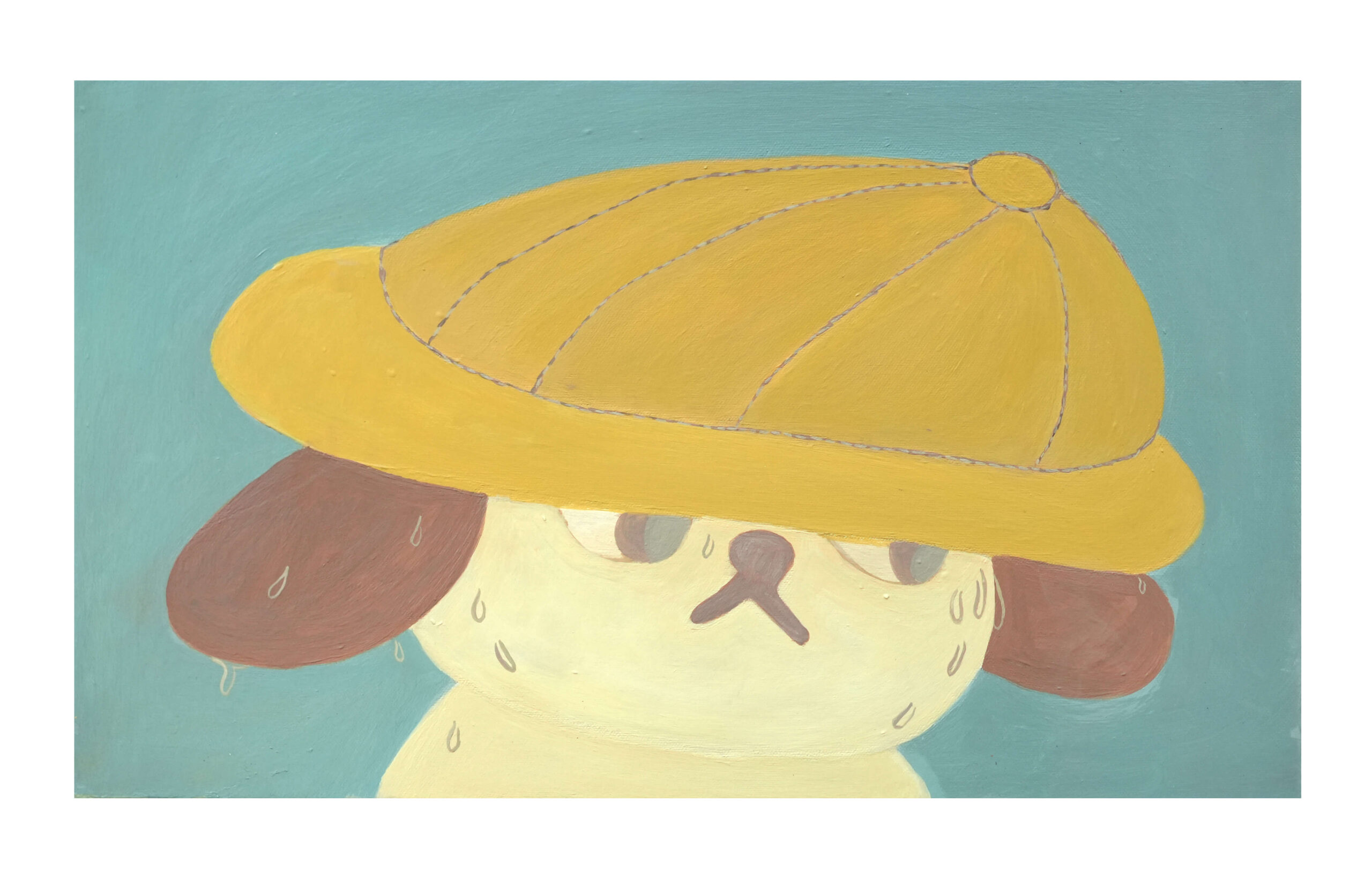 「狗仔」擁有一對長長的耳朵、圓滾滾身形、下彎小嘴,在畫面裡既可愛又帶點落寞,看似天真卻不失思辨,像是介於孩童與大人之間的靈魂,有時雀躍跳動,有時靜靜凝視。在色彩運用上,Fanko 偏好暖陽般的奶油黃或珊瑚粉,交織出柔軟和煦的基調,並常用壓克力的厚實層疊營造質地,讓畫面既豐盈又保有呼吸感。