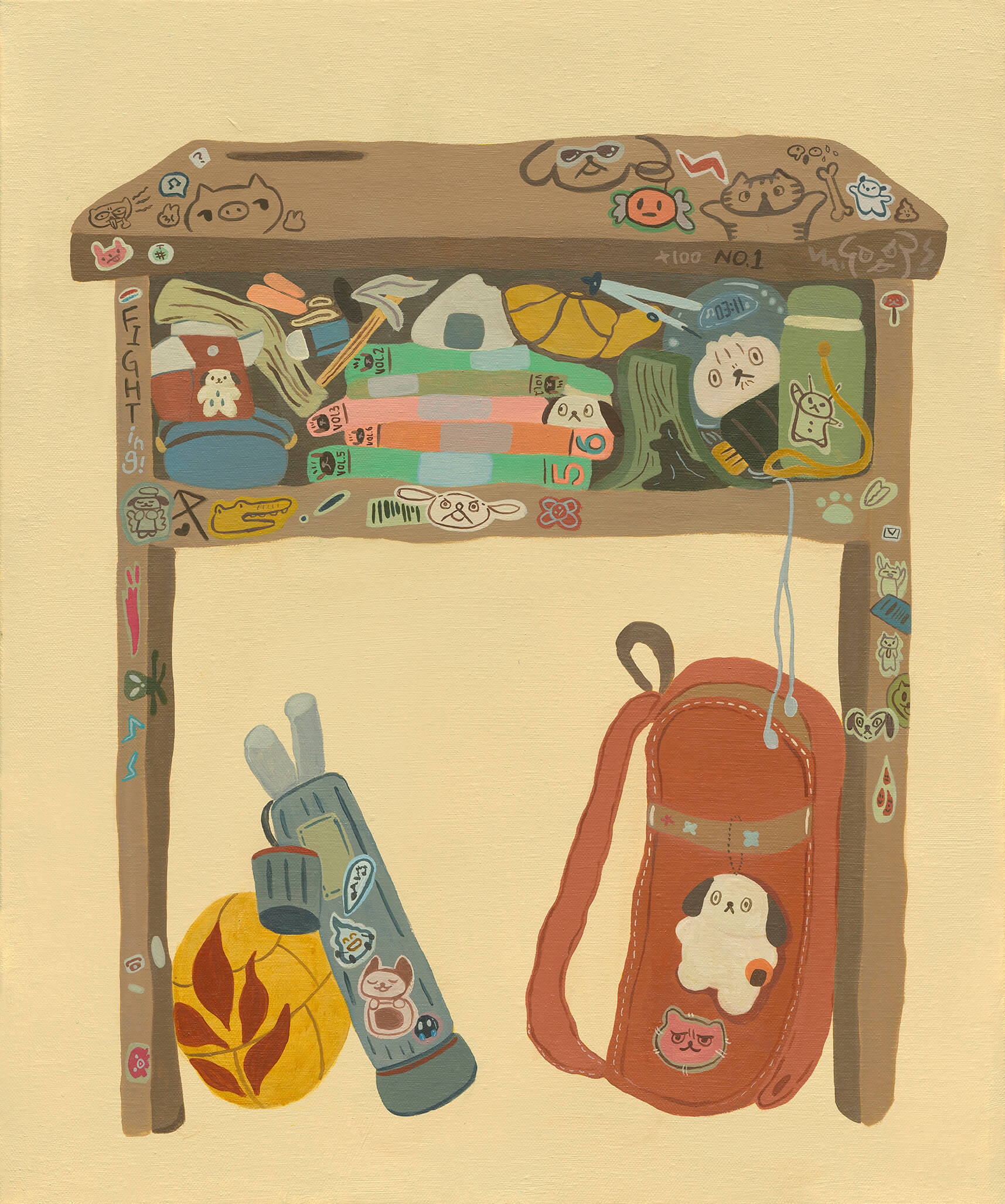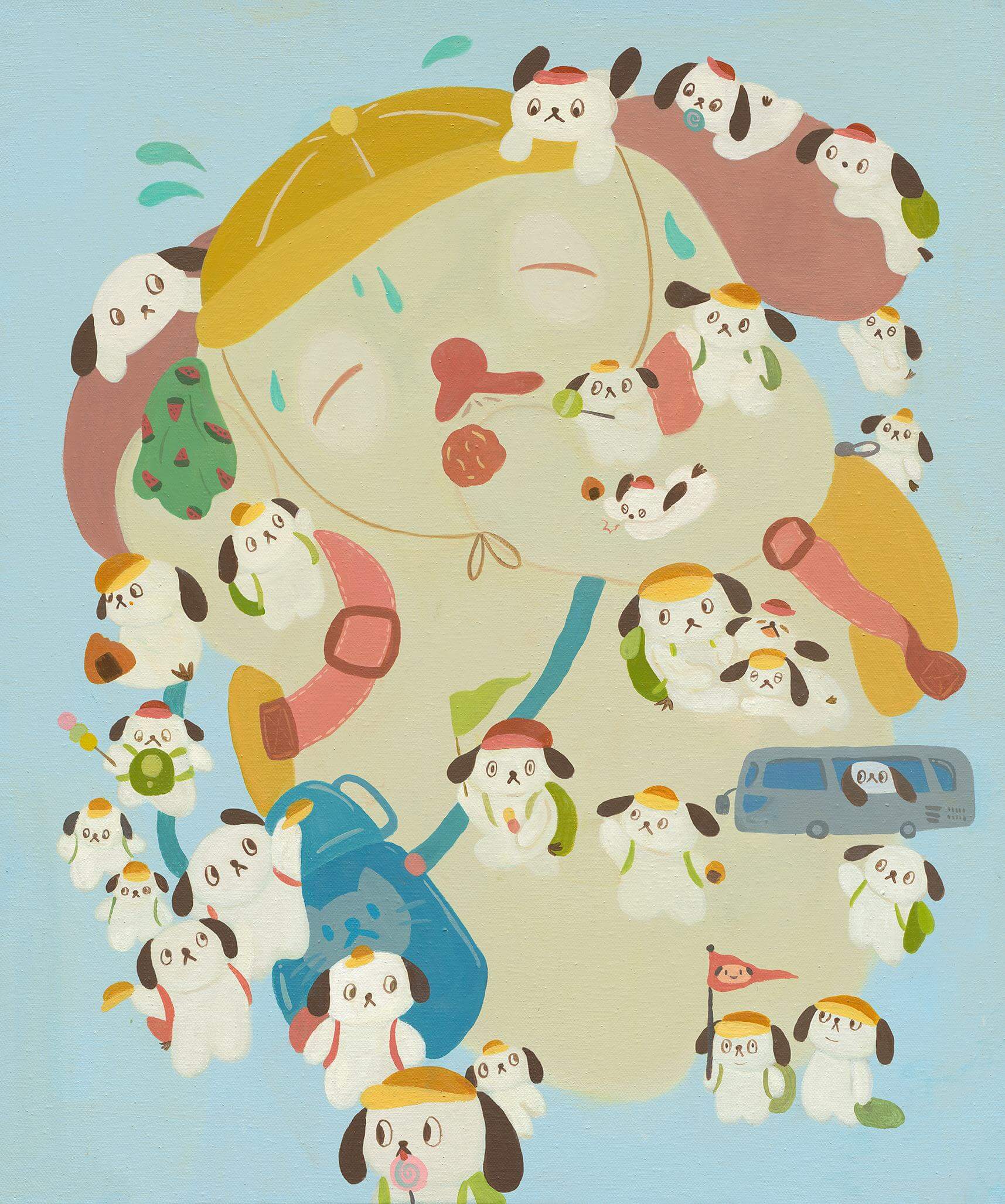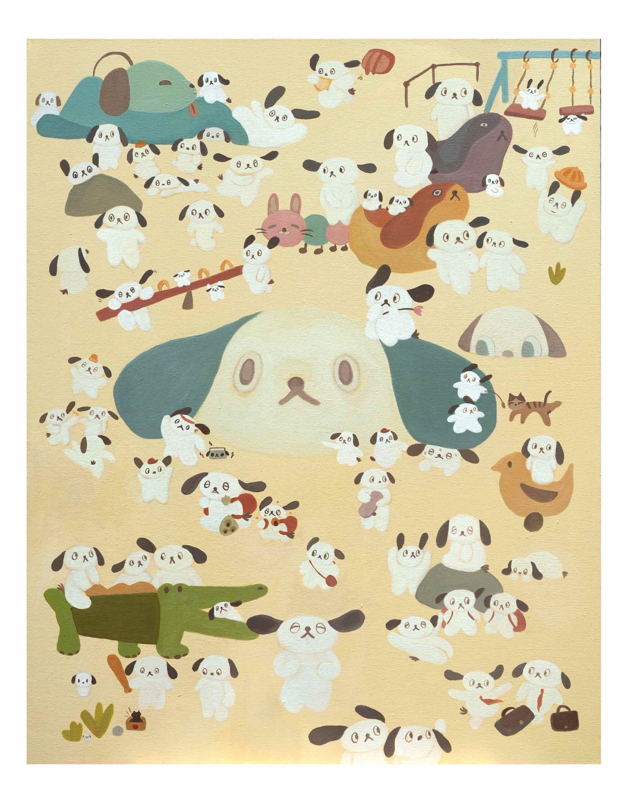 因此在此次展出的作品可以發現,畫面裡不是單線敘事,而是在同一個時空框架中並置多重片段。例如,〈遊樂設施搶奪大戰〉,有幾隻狗仔正踩在吱呀作響的盪鞦韆上;也有下課後背上書包、手拿仙貝玩著你追我跑的狗仔;不過最引人玩味的,是在畫角落偷偷闖入的「上班族狗仔」,牠們別著領帶、提著公事包,卻被藝術家刻意縮小比例,像是誤闖童年樂園的長大版本自己。