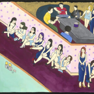 Ni utilized the composition characteristics of a horizontal scroll to slowly develop the story plot that forms her I-Novel. Figures in Ni’s painting are simultaneously seen and put on display. To create a strong visual and sexual impact, the women’s critical parts are hidden to enhance the effect that there is indeed something to be seen. This treatment is a bold statement of the intensified power of this digital era. Just like the Di Renjie depicted by Robert Hans van Gulik, the painting genre of Ni can be seen as a mirror that reflects the desire to compare the East and the West, the lives of contemporary women, and gender power.